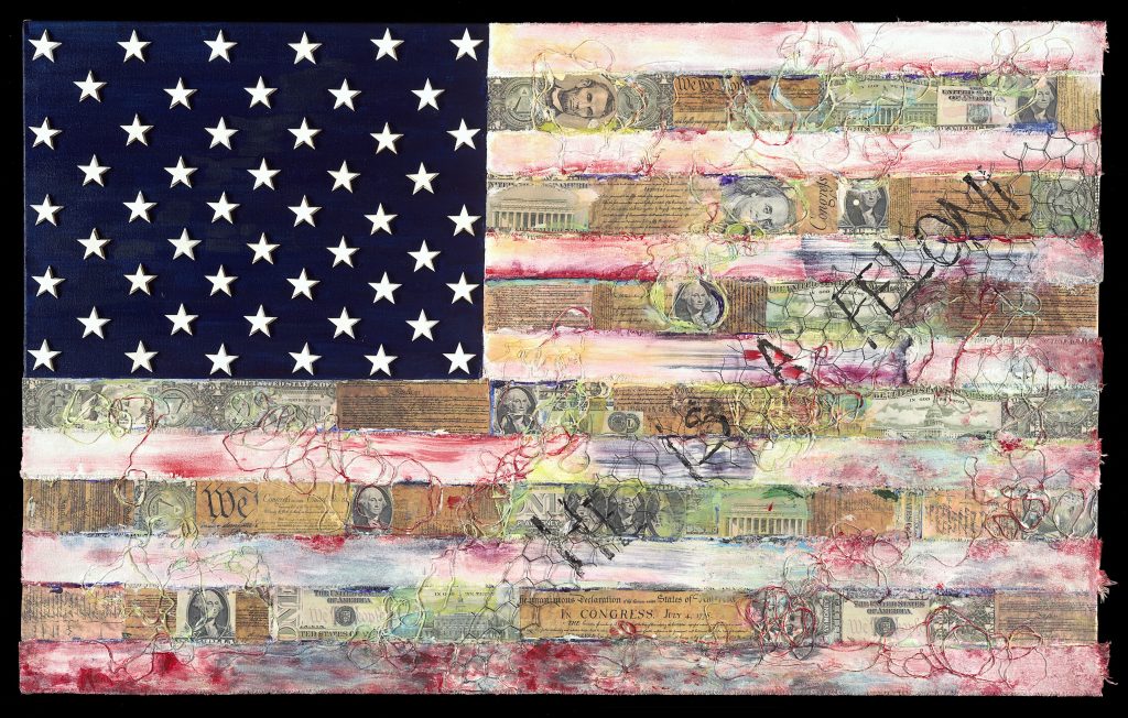 The addition of the founding documents of the United States symbolizes the struggle we have endured. The colors that I use in the flag and landscape paintings embodies the beauty and wonder of our spirit and the written words found throughout the work are a testament to the very nature of who we are as a people.